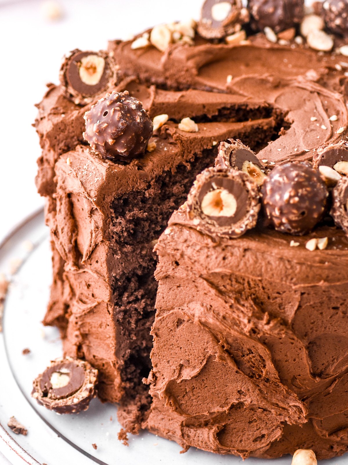 - Step 4: Add the third layer of cake on top, and press it down gently to secure it, making sure the layers align. Pipe the frosting over the tops and sides of the cake and use a knife to create swirls in the frosting. Use whole and halved Ferrero Rocher chocolates and the remaining toasted hazelnuts to decorate the top of the cake. Slice, serve, and enjoy!