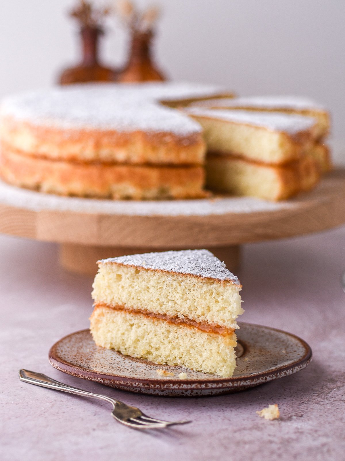 - Step 6: Place one cake layer on a cake plate and spread a layer of jam over the surface. Place the second layer of cake on top of the jam and dust the top of the cake with powdered sugar. Serve and enjoy!